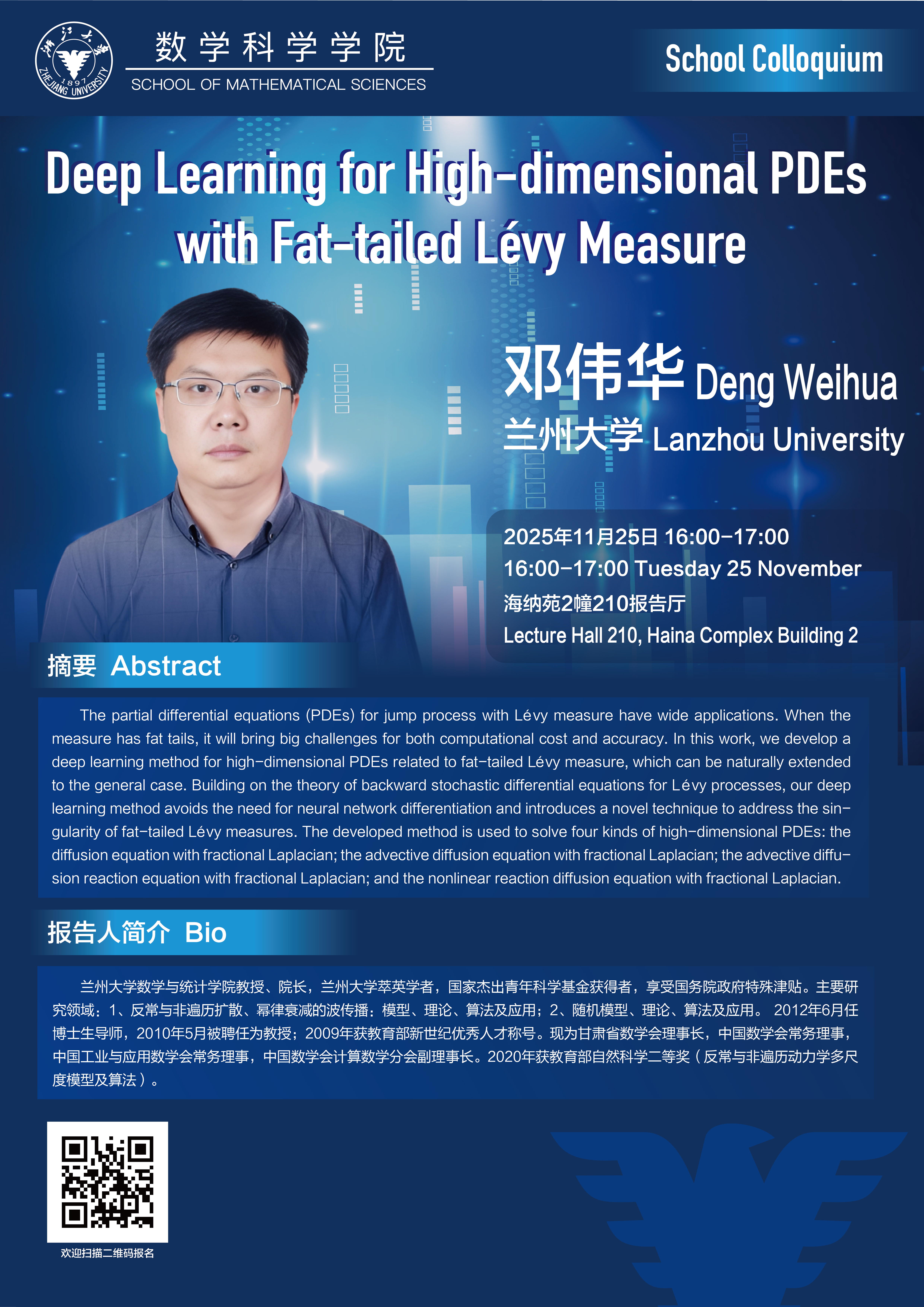 【数学学院】邓伟华:Deep Learning for High-dimensional PDEs with Fat-tailed Lévy Measure